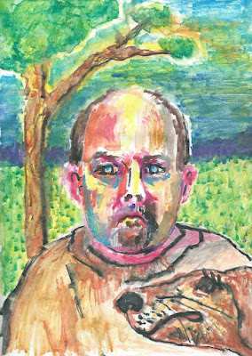 My weird artist is BRYAN LEWIS SAUNDERS. He has done self-portraits since March 1995. So, he has done over 12,000 self-portraits. I have only done two self-portraits. I start another one. Confession time...I only have the background done.